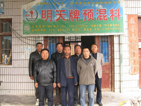 第一排右一为孟州经销商李红星;第二排左一为河南大区经理谢贵锋;第一排左一为豫北区经理程红旗;其他几位为规模养殖场客户。
