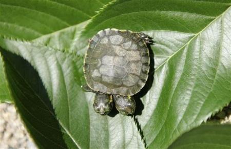 2008年5月27日,日本森山,一个男孩在公园内发现一只双头红耳龟。