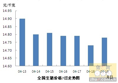 据猪e网行情小组570名网站官方报价员提供的当地生猪报价信息统计,2011年4月19日全国生猪平均价格为14.78元/千克,较前日(4月18日)14.73元/千克上涨0.05元/千克,p=0.1336,差异不显著;较上周同期(4月12日)下跌0.01元/千克,p=0.4193,差异不显著。猪粮比为7.02:1,较前日下跌0.10。