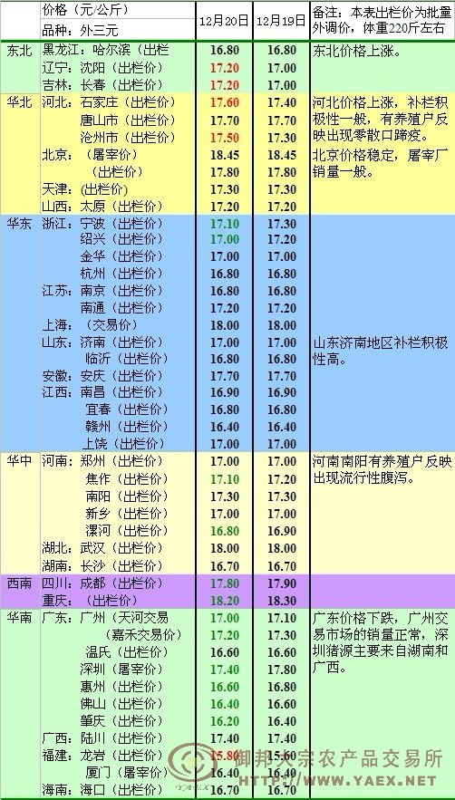 昨日湖南生猪出栏均价16.94元/公斤,与前日相比上涨0.07元/公斤。其中长沙、湘潭、株洲、郴州等地生猪出栏价16.70-17.80元/公斤,岳阳、益阳、常德、邵阳、娄底等地生猪出栏价16.70-17.00斤,衡阳、永州等地生猪出栏价16.80-16.90/公斤,12月20日全国生猪出栏均价17.18元/公斤,全国猪粮比7.53:1。其他地区生猪价格请见下表。